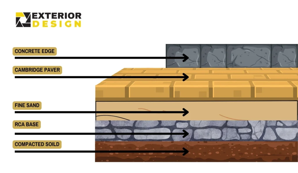 In the final stages, we add a concrete edge to the exposed perimeter of the patio. This edge acts as a restraint, ensuring that the pavers stay firmly in place. The concrete is set about 1 inch below the top of the paver and is then covered with topsoil for a seamless finish.
